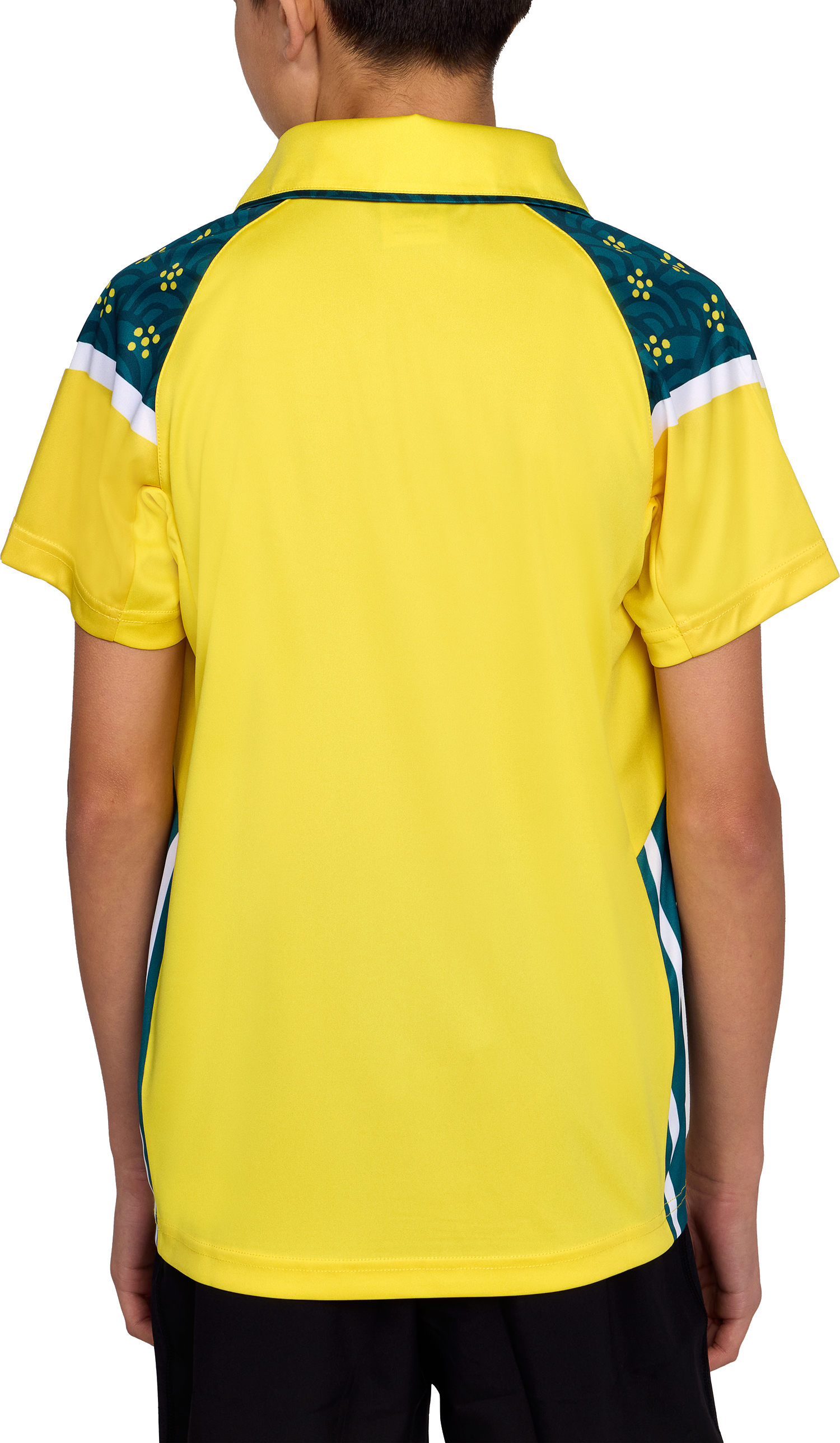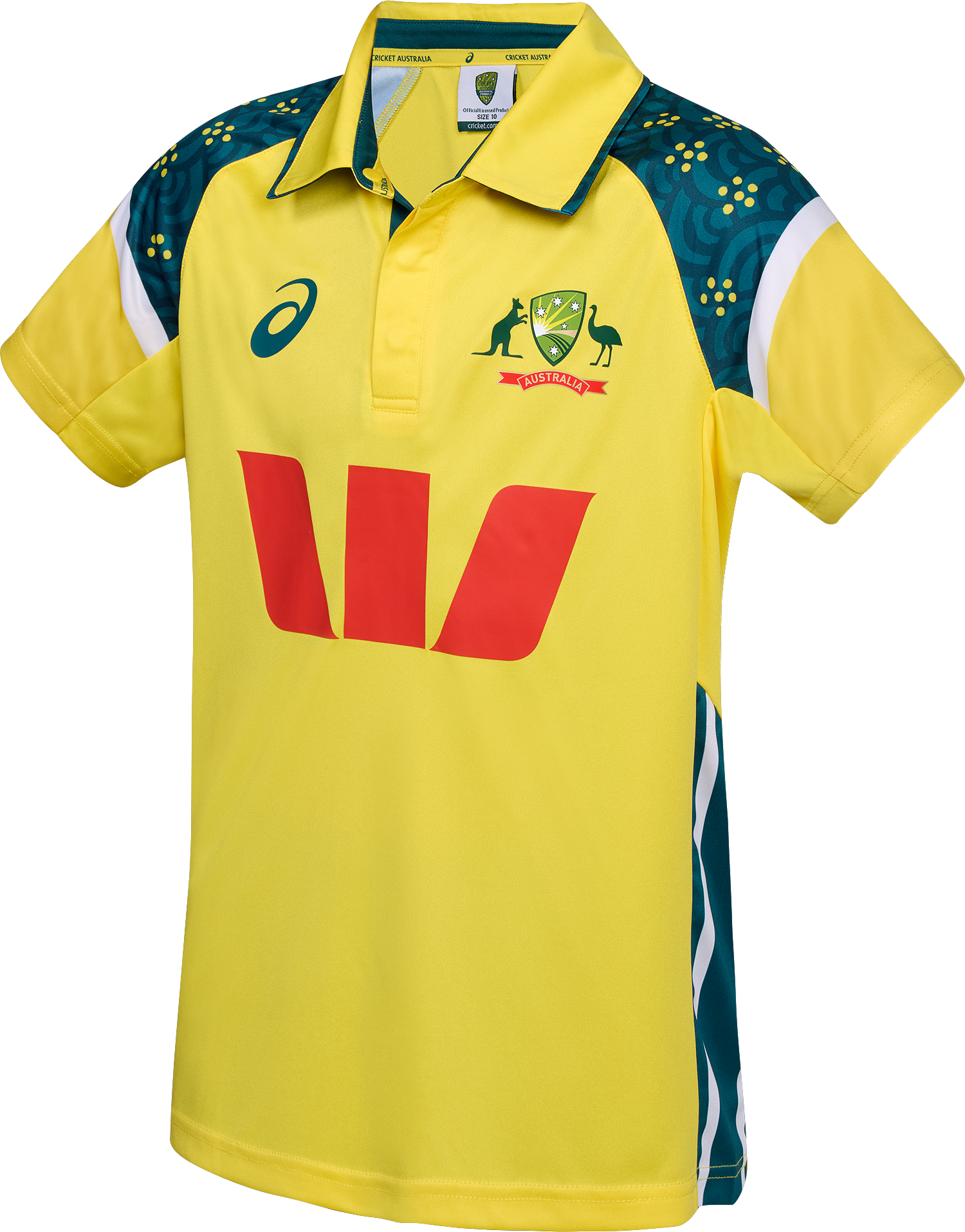The new 2025-2026 CRICKET AUSTRALIA REPLICA ODI SHIRT YOUTH features Indigenous artist Aunty Fiona Clarke's NEW Walkabout First XI design which appears throughout the match day collection showcasing Cricket Australia's continued support of Diversity & Inclusion in the community.