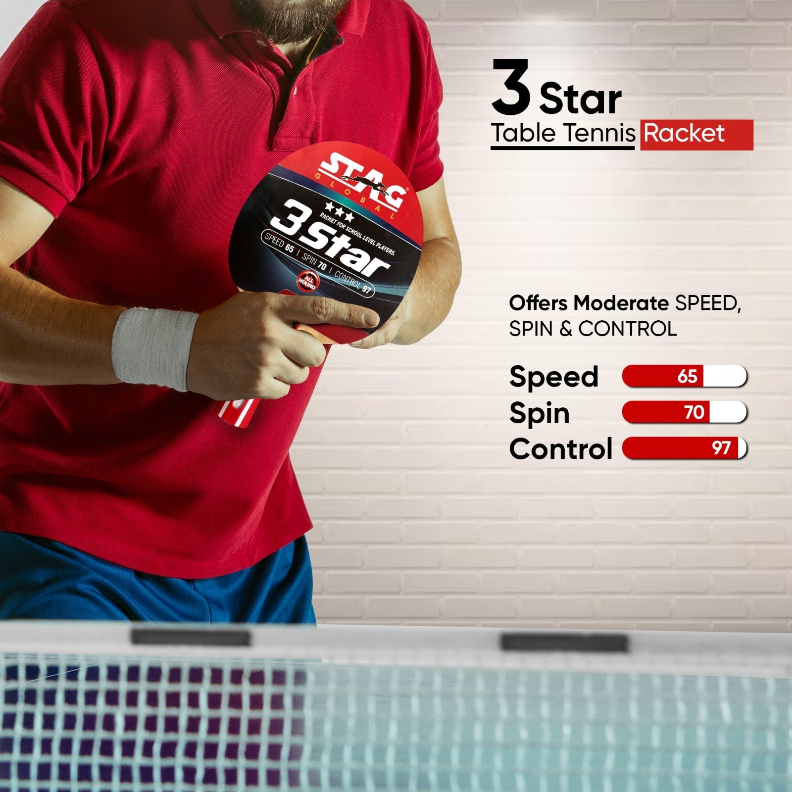 The STAG GLOBAL 3 STAR Table Tennis Racket is designed for school-level players seeking a balanced combination of control, spin, and speed. Crafted from engineered wood and equipped with ITTF-approved hard rubber, it features a 2 mm sponge for enhanced responsiveness.